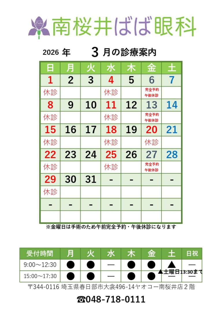 ※2月14・21・28日、3月14・21・28(金)は、手術のため午前11:00受付終了 午後休診となります。
