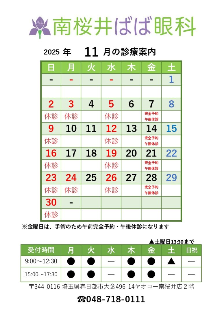 ※11日・18・25(金)は、手術のため午前11:00受付終了 午後休診となります。